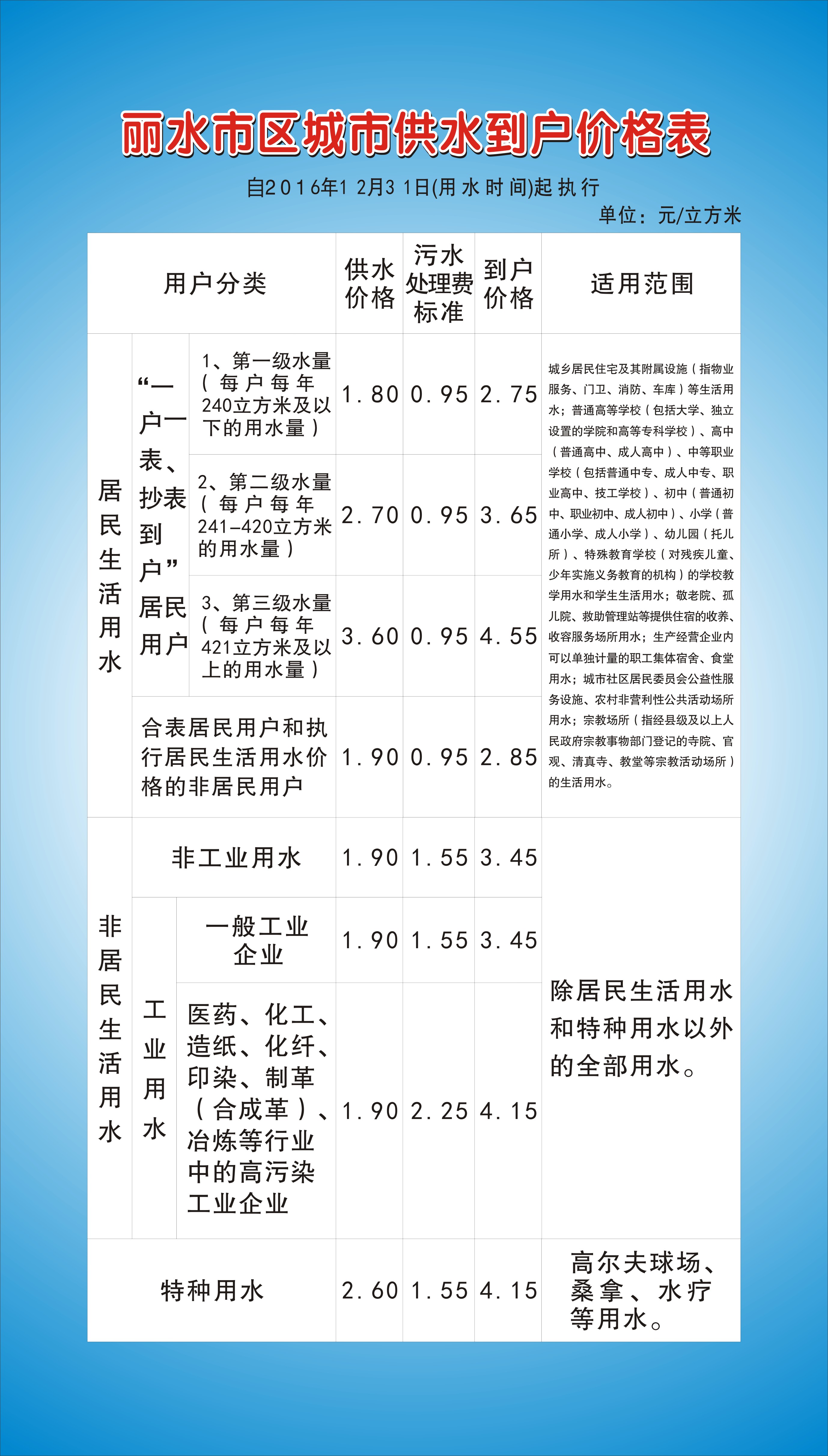 歡迎您使用本公司的自來水。根據(jù)麗水市發(fā)改委改價管【2016】470號《關于麗水市區(qū)污水處理費改革的通知》的文件精神,從2016年12月31日(用水時間)起執(zhí)行新的收費標準。原麗發(fā)改價管【2013】155號《關于調整市區(qū)非居民生活污水處理費標準的通知》同時廢止。